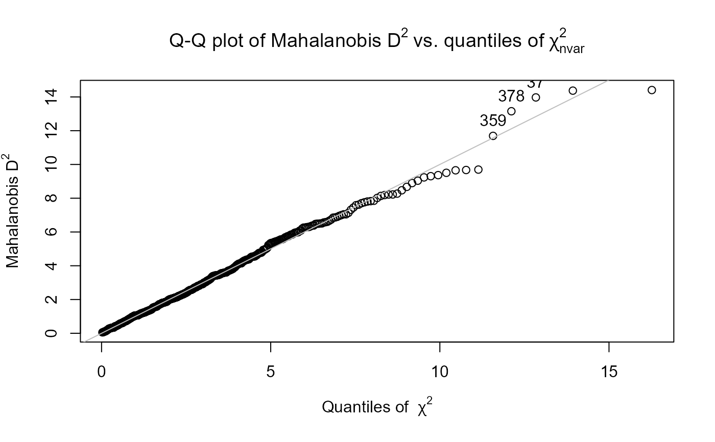 Currently the method implemented uses the Mahalanobis distance to detect outliers, such that only numeric variables are supported. The critical chi-square value lies at the 99.9% mark and is based on the number of variables used in calculating the distances.